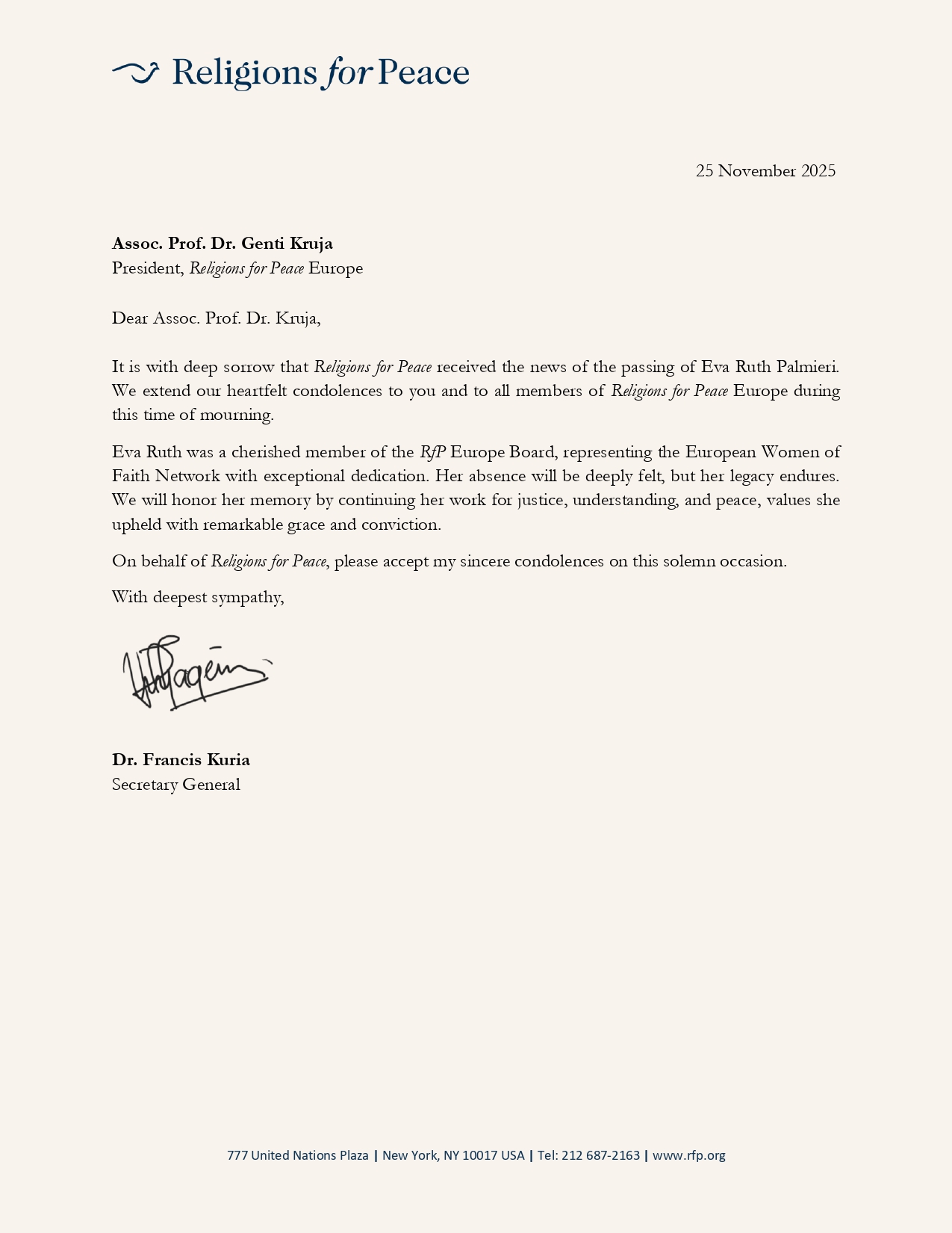 Religions for Peace International, in an official letter addressed to the President of Religions for Peace Europe, Assoc. Prof. Dr. Genti Kruja, conveyed its heartfelt condolences to him and to all members of RfP Europe on the passing of RfP Europe Board Member Eva Ruth Palmieri.