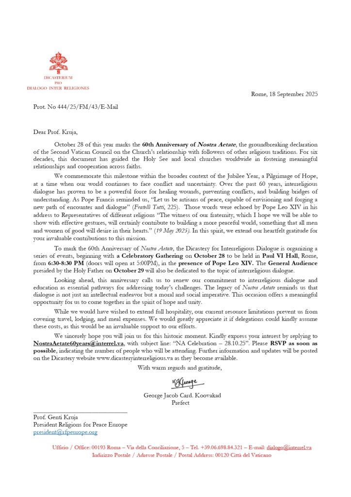 At the invitation of the Vatican’s Dicastery for Interreligious Dialogue a delegation composed of co-committee leaders and Board members of Religions for Peace Europe participated in the celebration of the 60th anniversary of Nostra Aetate, held in the Vatican on October 28–29, 2025. The RfP Europe delegation was invited by Mons. George Jacob Card. Koovakad, Prefect of the Dicastery for Interreligious Dialogue of the Vatican, who addressed Prof. Genti Kruja, President of Religions for Peace Europe.